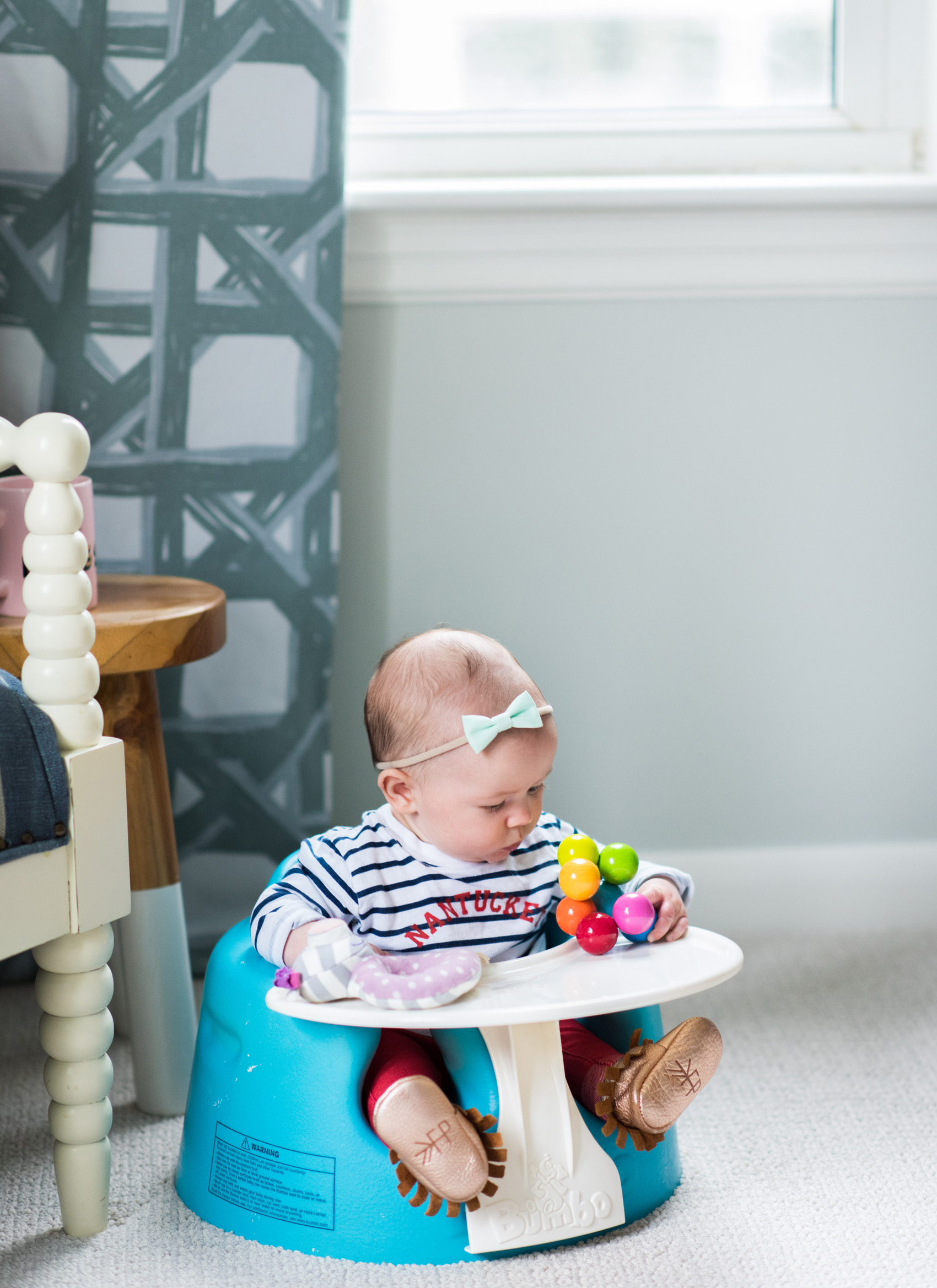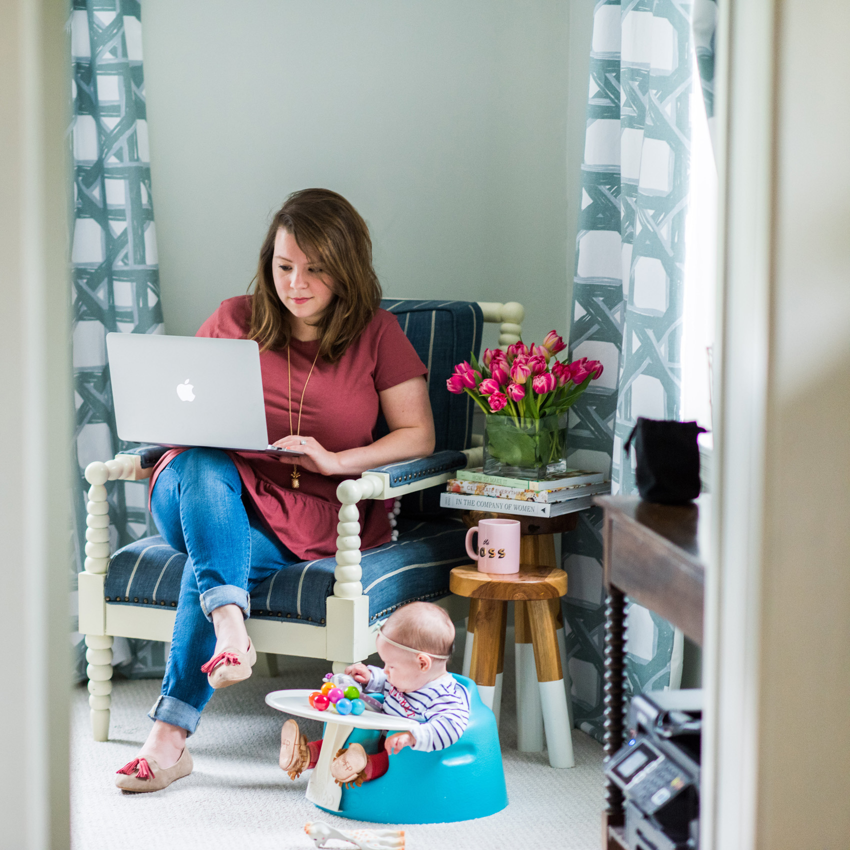 Adjusting my working hours, staying organized, and getting some outside babysitting help have all been hugely helpful steps in finding a manageable working-mom routine. I’ve also been leaning on a handful of helpful products to keep Jane contained and busy while I’m working. Perhaps our most-used baby item is our Baby Bjorn Bouncer. The way this bouncing chair is designed made it easy for us to pop Jane in there even before she had tons of head control – which was a lifesaver. She hangs out in this while I’m in the shower, cooking, eating, or working on photographing projects. I also love that it folds up, and comes with a cute toy bar that she’s starting to enjoy now.