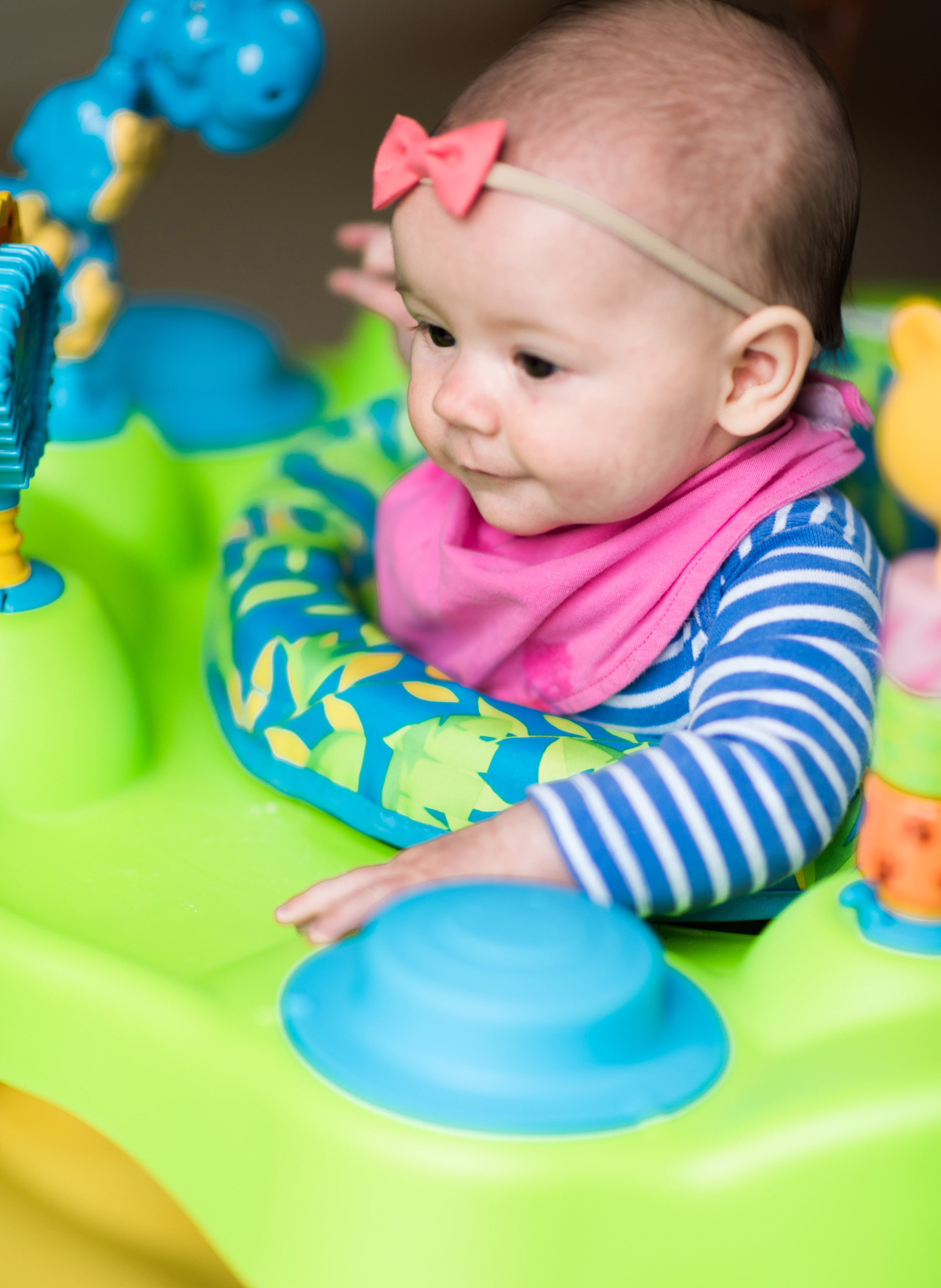 Just in the past week she’s finally gotten big enough to stand and play in an exersaucer that our friends gave us. I swore I would never have one of these things in our house because they’re giant and plastic and a bit of an eyesore, but then I saw her in it and my heart melted. I realized I can handle this giant thing clashing with my living room furniture for a few months when it makes her so happy. She looks like such a big kid standing up in it, and it seems to be keeping her attention well now that she can swivel a bit to look and play with all of the toys.