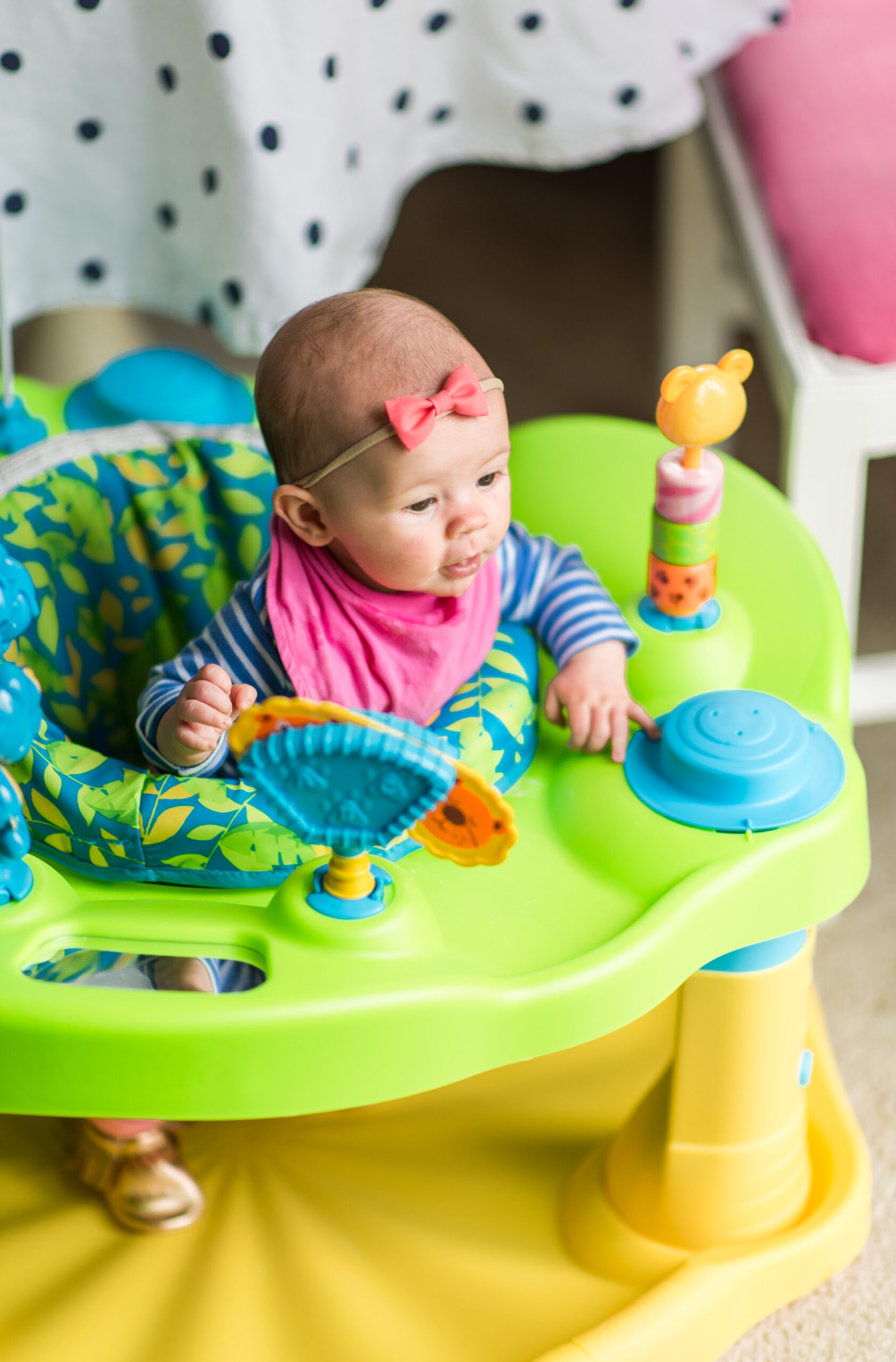 Adjusting my working hours, staying organized, and getting some outside babysitting help have all been hugely helpful steps in finding a manageable working-mom routine. I’ve also been leaning on a handful of helpful products to keep Jane contained and busy while I’m working. Perhaps our most-used baby item is our Baby Bjorn Bouncer. The way this bouncing chair is designed made it easy for us to pop Jane in there even before she had tons of head control – which was a lifesaver. She hangs out in this while I’m in the shower, cooking, eating, or working on photographing projects. I also love that it folds up, and comes with a cute toy bar that she’s starting to enjoy now. Another great place to pop Jane down in — now that she has a bit more head control — is the Bumbo seat. Friends of ours let us borrow this one and she loves sitting in it with the tray snapped on so she can slide her toys across it. She’s just starting to really get “playing” and has a small handful of favorite toys, including Sophie the Giraffe (of course!), this pretty wooden rainbow grasping toy, a few of the Organic Farm Buddies Rattles and a stroller toy bunny that makes a crinkly noise – she loves anything that crinkles.